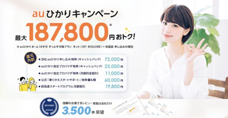auひかりのキャンペーンは数多くありますが、有料の必須加入オプションの有無と信頼性の高さを考えると、
